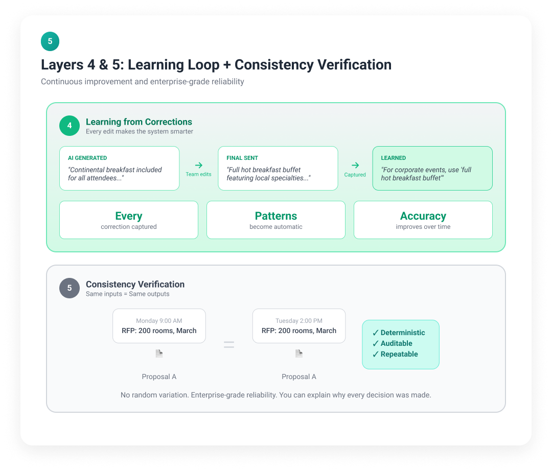 When sales edits a proposal before sending, that edit contains information. If you consistently change how breakfast is described, the system should learn. If you always adjust cancellation language for certain client types, that should become automatic.