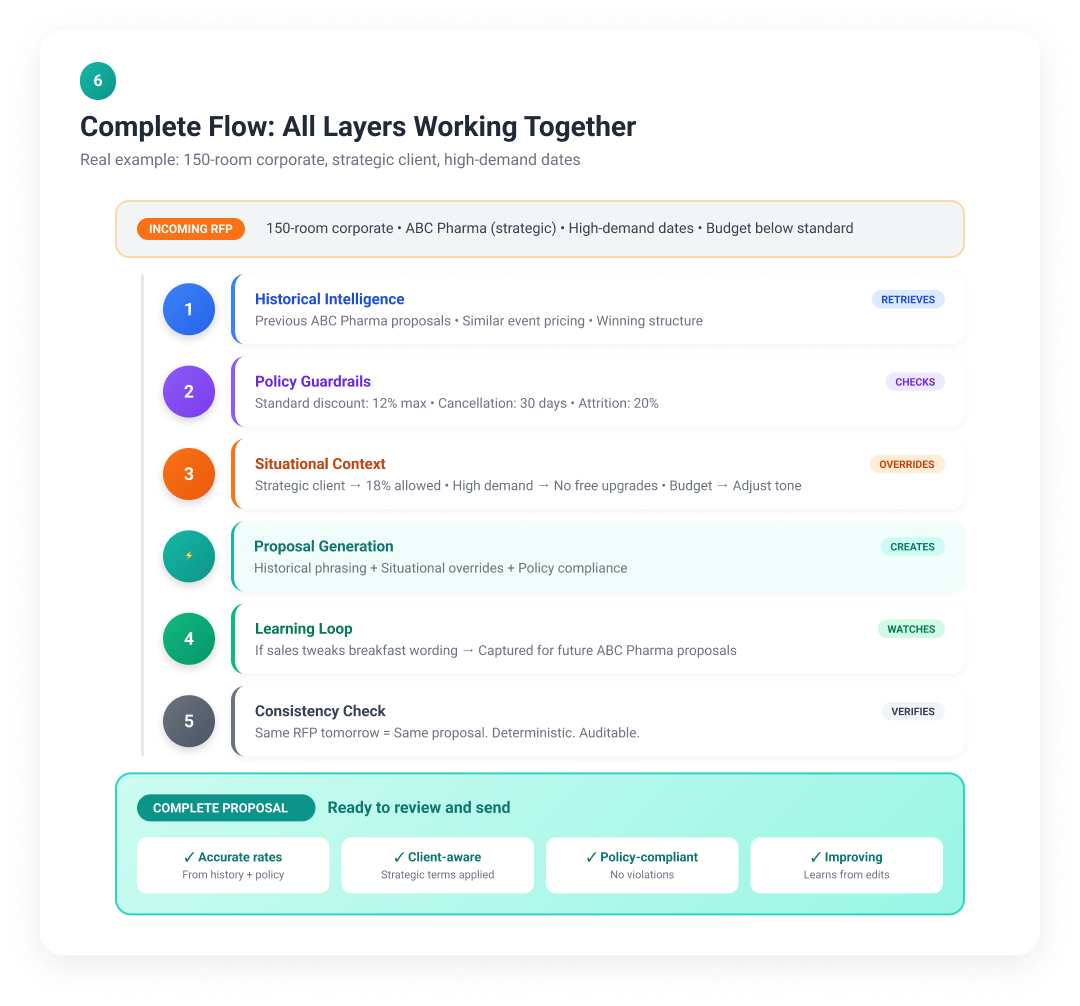 This is not just "past proposals" dumped into a system. It is structured knowledge: how you priced a 200-person corporate conference in March, what concessions closed the deal, what language resonated with that type of planner.