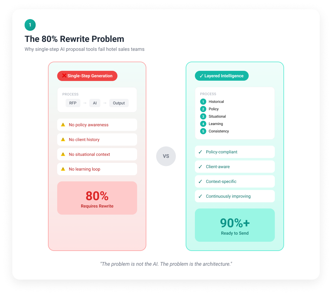 Most AI proposal tools don’t optimize for hotel sales. Discover how a layered intelligence architecture ensures accurate, policy-compliant proposals every time.