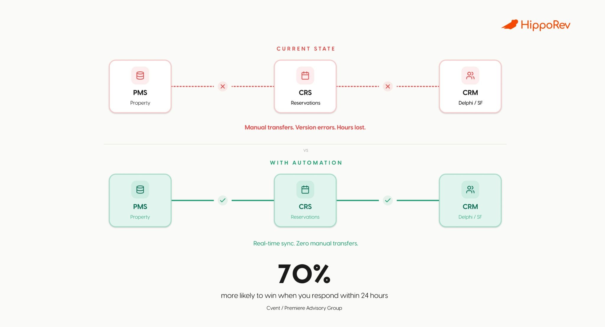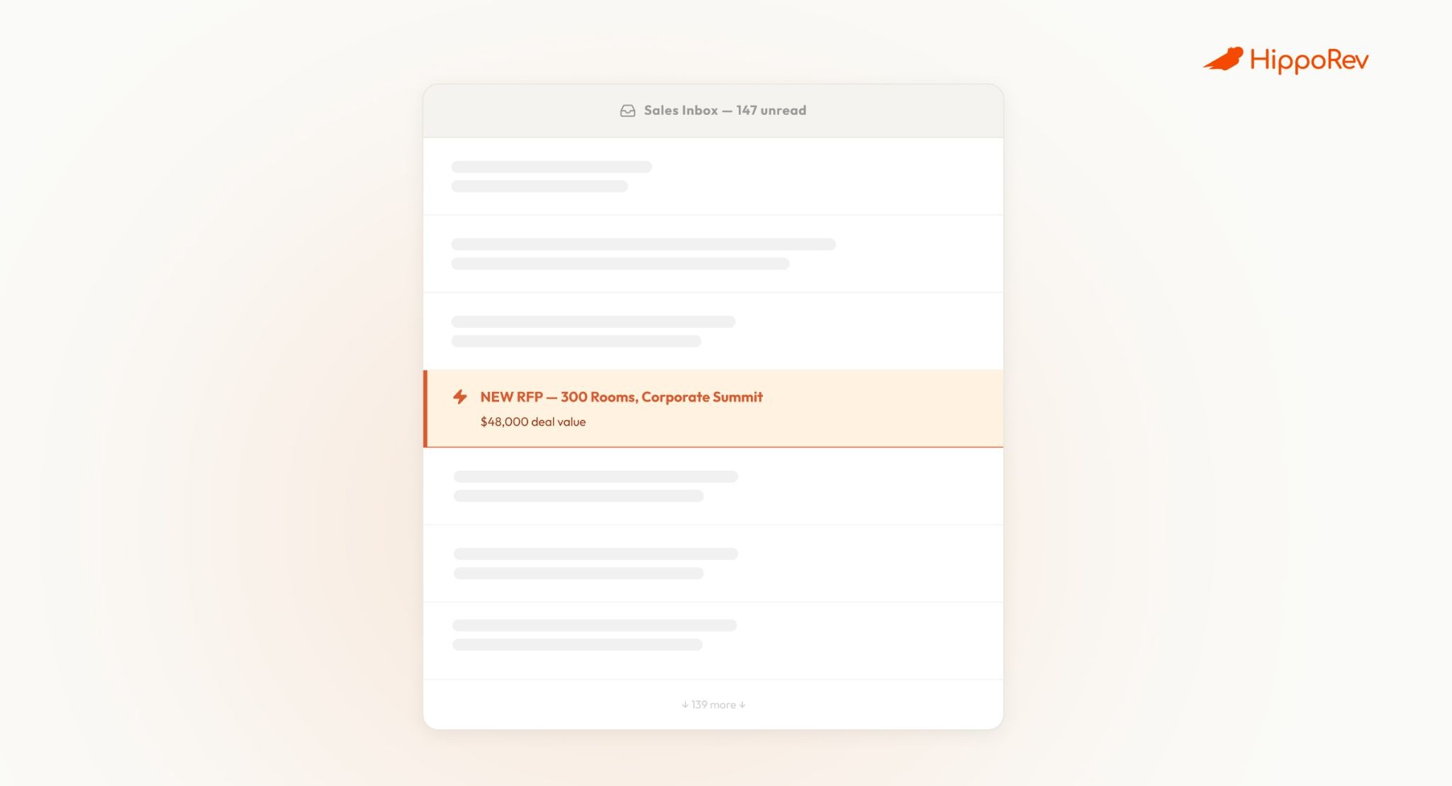 Increasingly, hotels are addressing these structural bottlenecks with workflow automation that removes the manual friction between each stage. Hippo Rev is built around this exact idea: automatically capturing RFPs from multiple channels, gathering missing event details, generating proposal drafts, and syncing information across systems so sales teams can focus on the client instead of the paperwork.