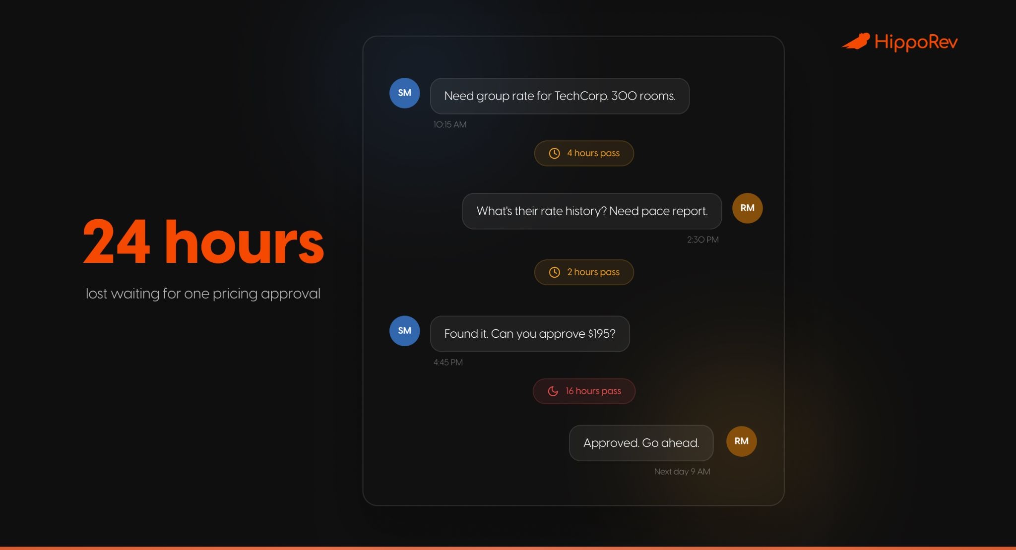 But Revenue Management is also busy. They are analyzing pace reports, adjusting transient rates, and sitting in their own meetings. The sales manager's pricing request sits in the Revenue Manager's inbox.
