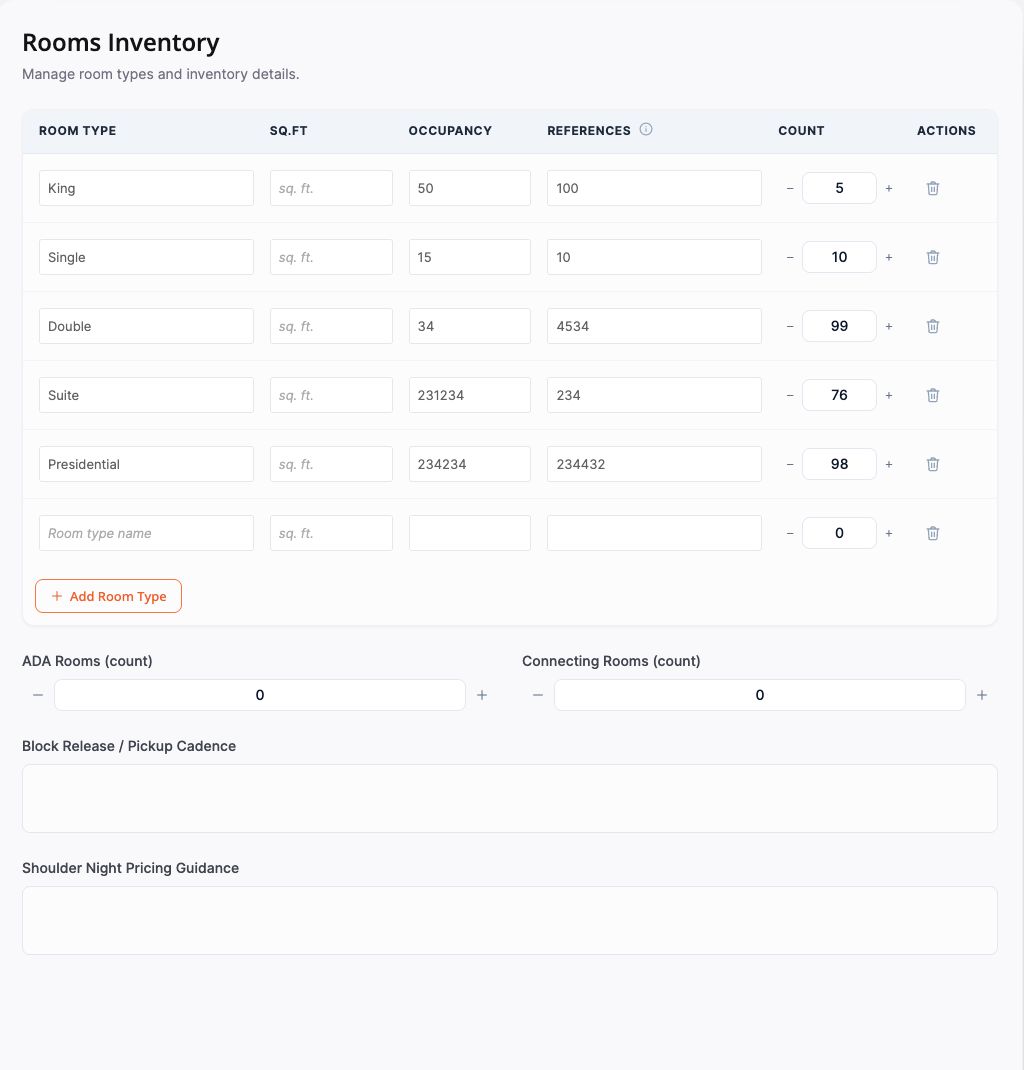 AI Extraction from PDFs reduces onboarding friction for hotels with existing documentation. Rather than requiring manual re-entry of room specs, the system reads and parses structured data from uploaded floor plans and spec sheets.