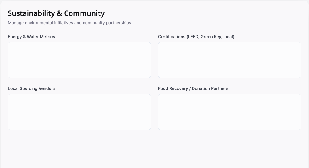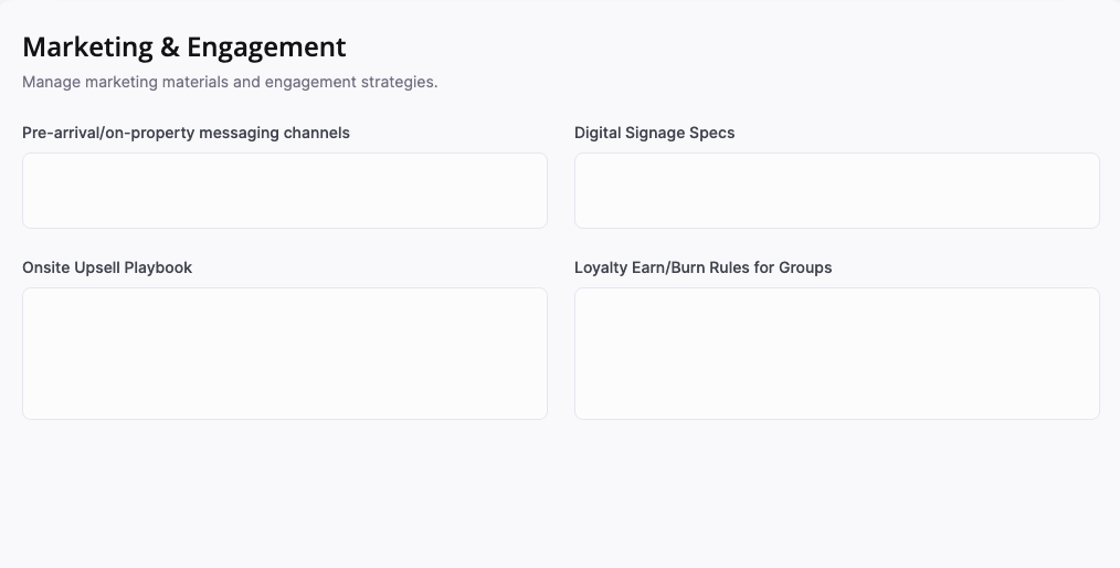 Instead of juggling multiple tools and documents, hotel teams complete a guided, 15-section onboarding process that captures: